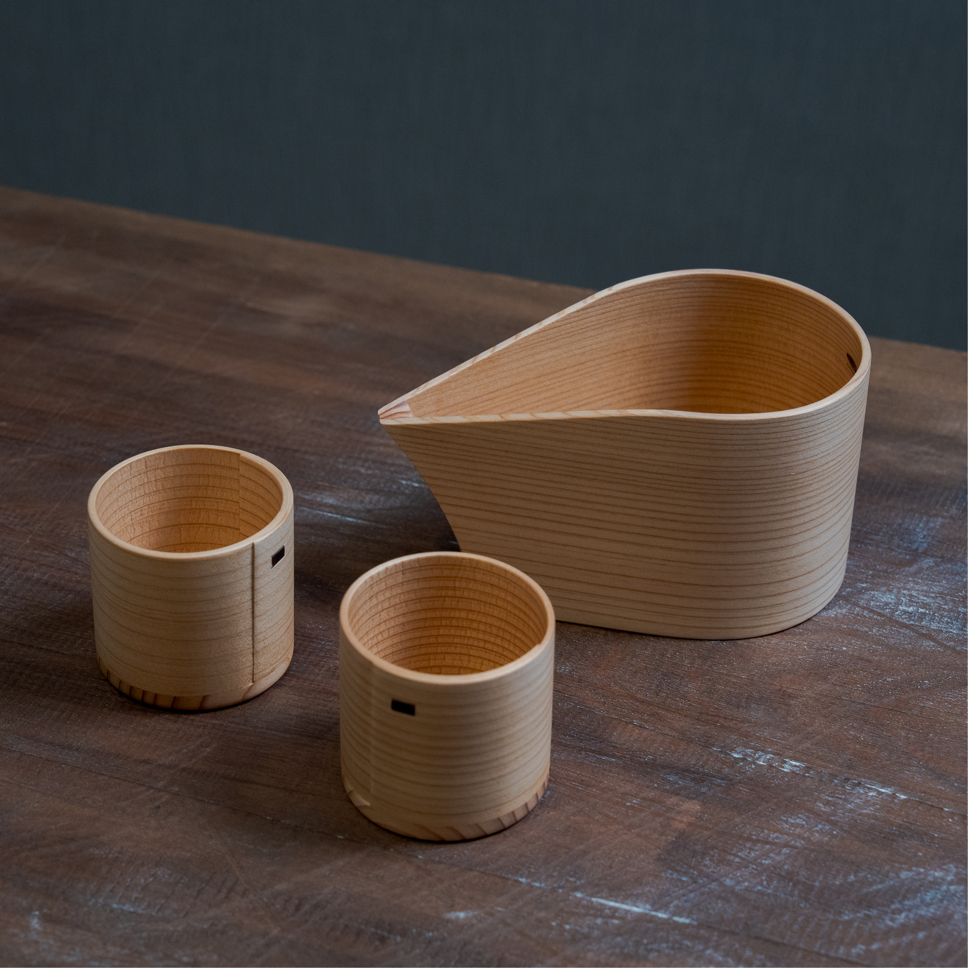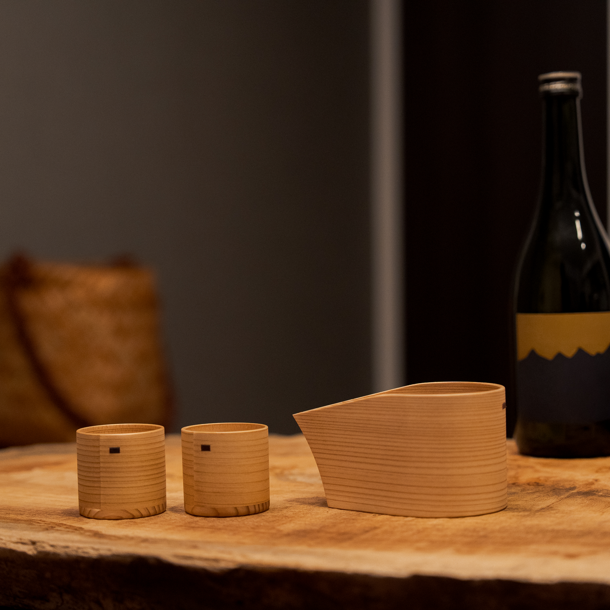 樹齢約100年の秋田杉。継ぎ目は桜の皮。日本の伝統工芸品指定の「曲げわっぱ」で作る酒器セット。職人たちが手作りの徳利とぐい呑みを揃えています。